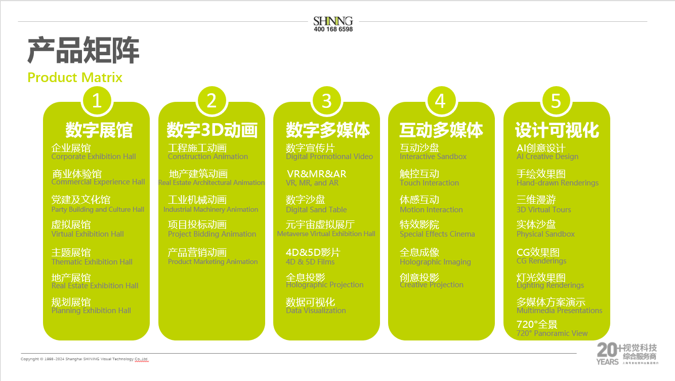 作为拥有20多年技术积累的企业,写意以“赋能客户、创造价值”为使命,依托前瞻性的创意策略和全案整合能力,涵盖数字展馆、数字3d动画、数字多媒体、互动多媒体、互联网开发及设计可视化六大业务单元,为客户提供优质的视觉科技服务。